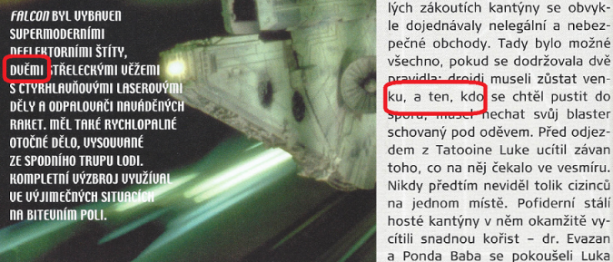 Texty velmi často popisují právě známé věci z filmů (čest výjimkám) a na atraktivnosti ztrácí rovněž proto, že je celý text psán v minulém času (jako učebnice dějepisu, nikoli encyklopedie). Pro větší zaujetí by nebylo na škodu naopak psát v čase přítomném, zvýšilo by to dynamiku a zejména by na fenomén Star Wars nahlíželo jako na stále živý (což je, protože stále vychází nová knižní díla). Pokud se však už rozhodly tvůrčí osobnosti pro čas minulý, měly by u něj setrvat. V sekci zákulisí se totiž píše: „První etapa: vzniká dřevěná kostra lodi ve skutečné velikosti.“ Paní češtinářka ze základní školy by jistě potvrdila, že je třeba setrvat u jednoho stylu.