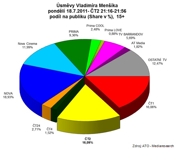 ČT2 v pondělí 18. července zaznamenala rovněž vysoké hodnoty sledovanosti. Divákům totiž Dvojka zprostředkovala setkání s Vladimírem Menšíkem v sestřihu z nejzajímavějších komediálních rolí. Program Úsměvy Vladimíra Menšíka zhlédly 484 tisíce diváků starších 15 let (podíl na trhu 16,09%). „Jedná se o druhý nejúspěšnější pořad vysílaný na ČT2 v roce 2011 (sledovanější byla pouze poslední epizoda dokumentu Yellowstonský národní park, kterou v pátek 27. 5. vidělo 493 tisíc dospělých),“ doplňuje Česká televize.