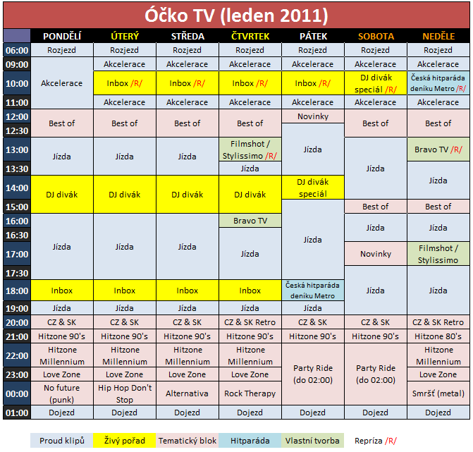 Hudební televize Óčko přistoupilo od nového roku k úpravě programového schématu. V něm dochází k několika větším změnám. Polední vysílání obstará nově hodinový blok tematických klipů Best of… věnovaný jednomu interpretu či tématu. DJ divák mění stopáž na dvě hodiny a posouvá se na 14. hodinu. Změna potkala živý kontaktní pořad Inbox, dostává se do prestižnějšího času v 18:00 od pondělí do čtvrka. K úpravám v programu přistoupilo Óčko na základě výzkumu sledovanosti.