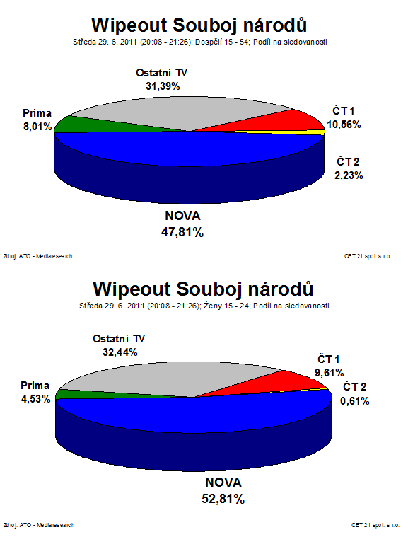 Televize Nova odvysílala ve středu 29. června první díl velké letní hry Wipeout Souboj národů. Hned první epizoda vzbudila velký zájem, trojice Jana Sováková, Ondřej Brzobohatý a Maroš Kramár sice soupřům podlehla, diváci však jejich bojování ocenili. V cílové skupině Dospělí 15-54 dosáhla TV Nova podíl na trhu 47,81%, v cílové skupině Ženy 15-24 let dokonce 52,81%. V absolutních číslech dosáhla TV Nova 771 tisíc diváků v kategorii 15-54, v širší skupině 15+ zhlédlo první díl 1, 181 milionu diváků při podílu 36,74%. Konkurenční Poštu pro tebe na ČT1 zhlédlo podle webu TN.cz 23,79% diváků ve věku 15+ (739 tisíc).
