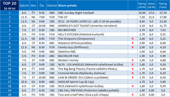 Diváci se ovšem zajímali též například o nabídku stanice CBS, nejvíce sklidil pozornost dokument „9/11: 10 Years Later„, o deset let staré teroristické útoky se zajímalo 4% všech diváků, přičemž podíl na trhu byl 9%. CBS navíc představila své podzimní novinky v programu „CBS FALL PREVIEW„, zhlédlo jej 1,6% při share 5%.
