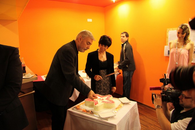 Od chlebíčků se podařilo vyhnat všechny. jedině šefredaktor RadioTV Juraj Koiš (muž v pozadí) statečně odolal a proto byl u dortu první. (Foto: TV Barrandov)