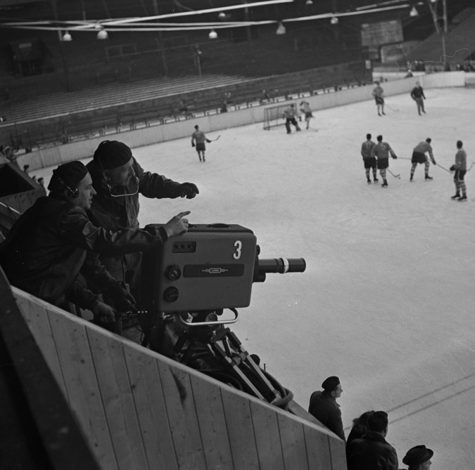 Zdroj: Česká televize. První přenos ze zimního stadionu, sportovní přenos ze stadionu Štvanice, datum pořízení 11 února 1955