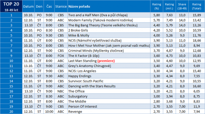 V úterý měl premiéru sitcomu Last Man Standing na ABC, v hlavní roli se představil Tim Allen (známý zejména ze seriálu Kutil Tim). Historicky první díl zhlédlo 4,60 milionu při podílu na trhu 10%. Výsledek je lepší o 9% ve srovnání s minulým rokem, kdy v tomto časovém slotu startovala premiéra seriálu No Ordinary Family (TV JOJ: Rodinka Úžasných). V tento den byl nejsledovanější seriál CBS s názvem NCIS (TV Nova: Námořní vyšetřovací služba), vidělo jej 5,13 milionu při podílu na trhu 11%.