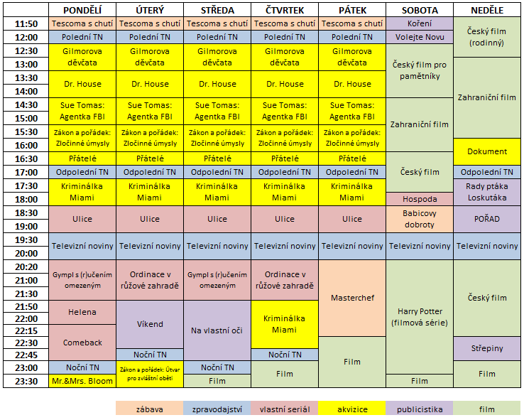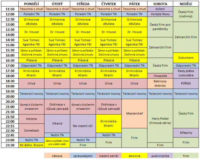 PROGRAMOVÉ SCHÉMA UVNITŘ – Televize Nova odhalila programové plány, její nový původní seriál Gymp s (r)učením omezeným půjde skutečně v přímé konkurenci novinky Primy family Obchoďák. Hospoda se tradičně dostane do sobotního access-time na 18:05 a dá prostor dennímu seriálu Ulice. Komerční jednička překvapivě vytváří nový programový slot, pondělky okolo 22. hodiny jsou vyhrazeny původním komediálním seriálům.