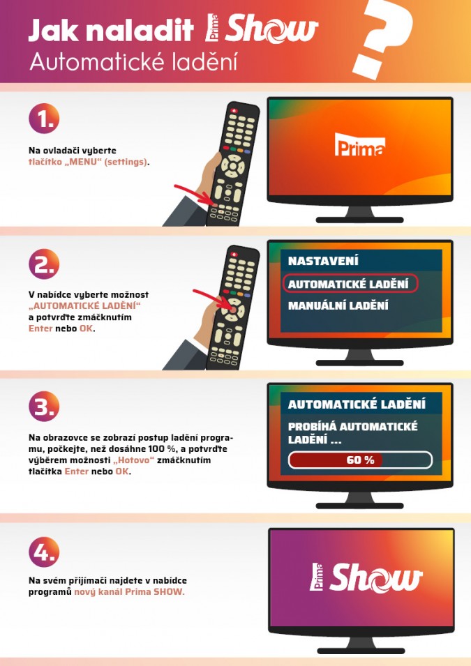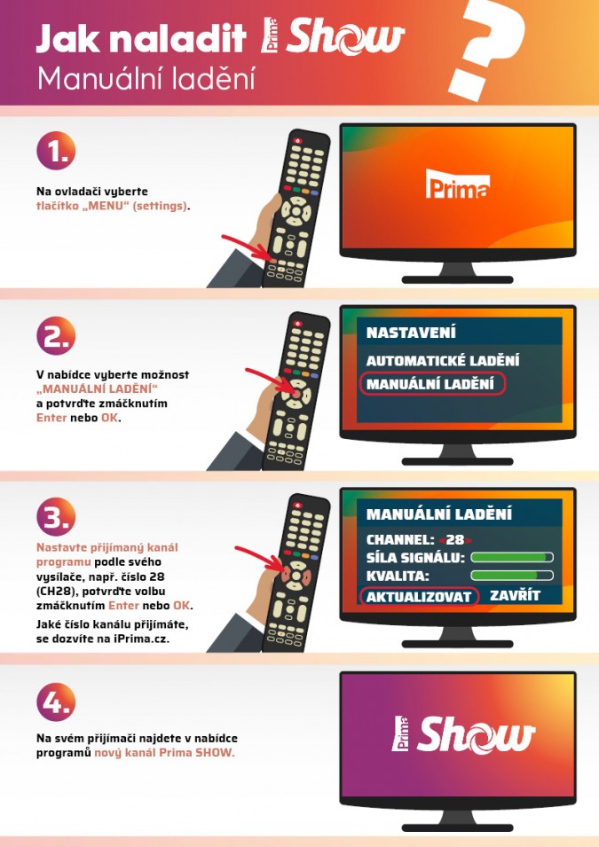 Diváci si mohou nejnovější přírůstek do rodiny Primy naladit už nyní – v DVB-T2, multiplexu 22 pod názvem Prima SHOW (na původní pozici Test-2). Připraveny jsou pro ně podrobné návody k automatickému i ručnímu ladění na www.iprima.cz. Prima SHOW bude dostupná také u operátorů Vodafone (pozice 19), T-Mobile (pozice 35), Sledovani.TV (pozice 20).
