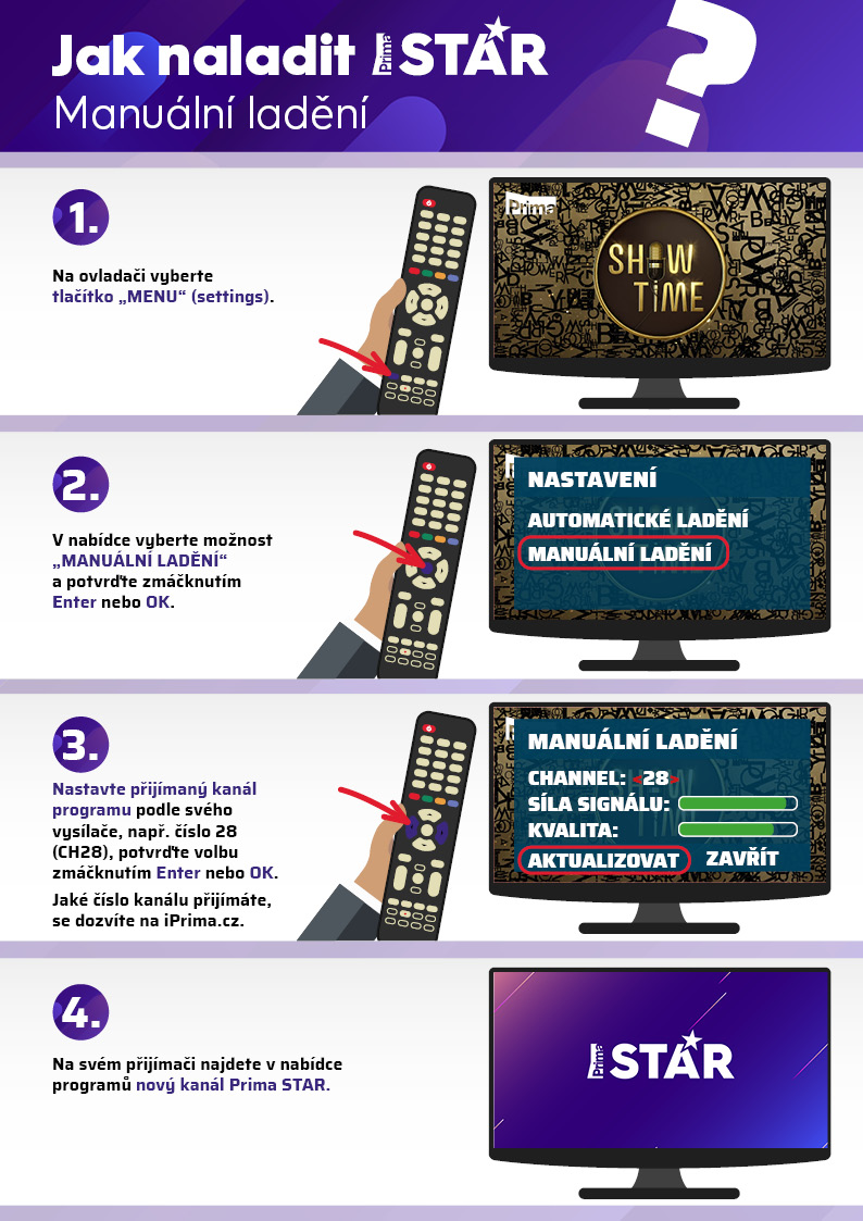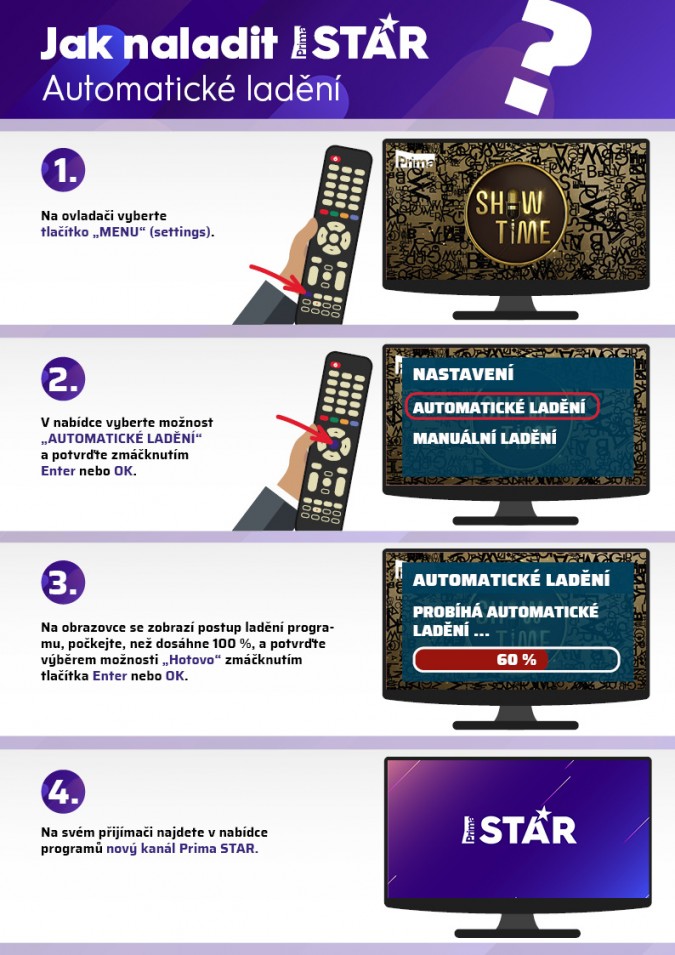 Nový kanál začne vysílat již příští pondělí, a to hned ráno. Diváci si ho mohou naladit už nyní – v DVB-T2, multiplexu 22 pod názvem Prima STAR (na původní pozici Test-1). Připraveny jsou pro ně podrobné návody k automatickému i ručnímu ladění na www.star.iprima.cz. Kanál bude exkluzivně dostupný i pro zákazníky T-Mobile TV od tarifu XS výše, kterým se naladí automaticky na EPG pozici 18.