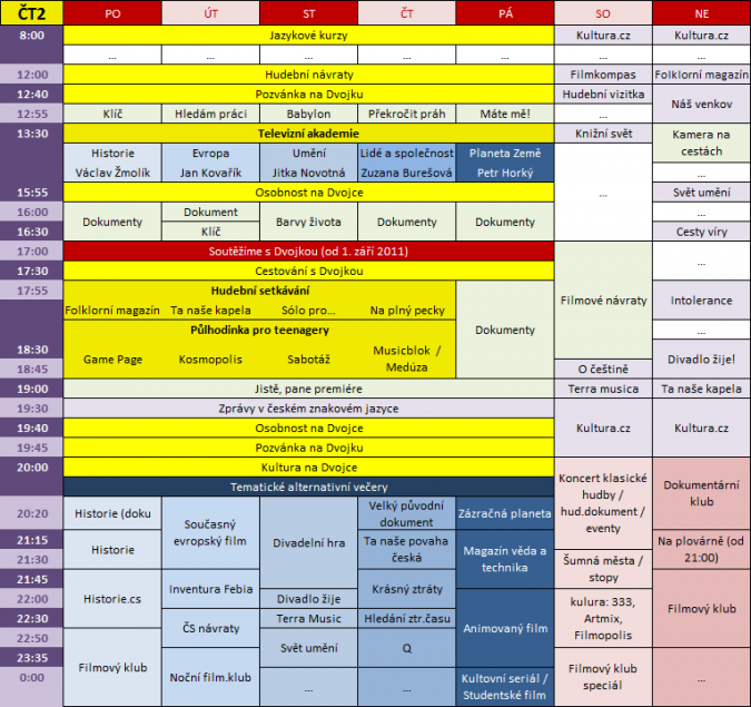 Ústředním mottem druhého veřejnoprávního kanálu „Hledání souvislostí„. Všední dny začínají na ČT2 reprízami z předchozího dne, od 8:00 začíná půlhodina jazykových kurzů, které původně Dvojka uváděla po sedmé večerní. Z programu mizí dopolední reprízy soutěže AZ-Kvíz. Poledne otevírá blok Hudební návraty, v nich diváci mohou pátrat v archivu České televize, namátkou uveďme jazzové koncerty, Příště u Vás z… nebo Kam zmizel ten starý song. Po skončení ve 12:40 následuje promo pořad Pozvánka na Dvojku (další blok v19:45). V programu Dvojky se během dne objeví další novinky, zamyšlení v pořadu Osobnost na Dvojce servíruje stanice v 15:55 a 19:40. Od září 2011 uvede ČT2 „Soutěžíme s Dvojkou„.