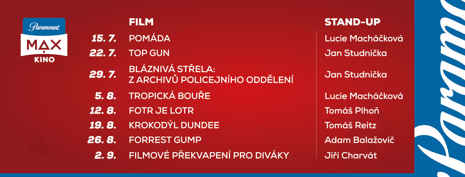 „Pro letošní ročník letního kina jsme připravili program složený především z komedií a oblíbených evergreenů, které, doufáme, pomohou lidem překonat složitou situaci posledních měsíců, zvednou jim náladu a navodí pohodovou letní atmosféru,“ říká Viktor Hetyei, brand director pro Paramount Networks Czech, a přibližuje i program letošního kina: Diváci se tak mohou těšit na Top Gun s Tomem Cruisem, legendární Pomádu, Bláznivou střelu, nebojácného Krokodýla Dundeeho nebo vynikající duo Robert De Niro a Ben Stiller v komedii Fotr je lotr.