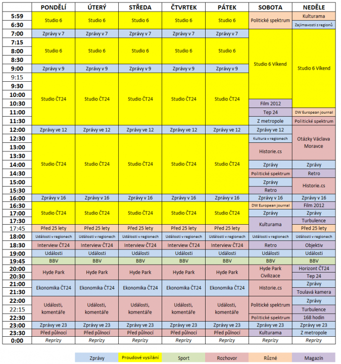 PROGRAMOVÉ SCHÉMA UVNITŘ – Česká televize zveřejnila programové schéma pro svůj zpravodajský kanál ČT24. Překvapivě z něj vypadává magazín o vědě a technice Prizma, končí též Ekonomika+, Tah dámou, Fokus ČT24. Větší prostor dostane Politické spektrum, které se bude věnovat krajským volbám. V programovém schématu dojde k několika posunům, přesto některé formáty zůstanou ve svém slotu.