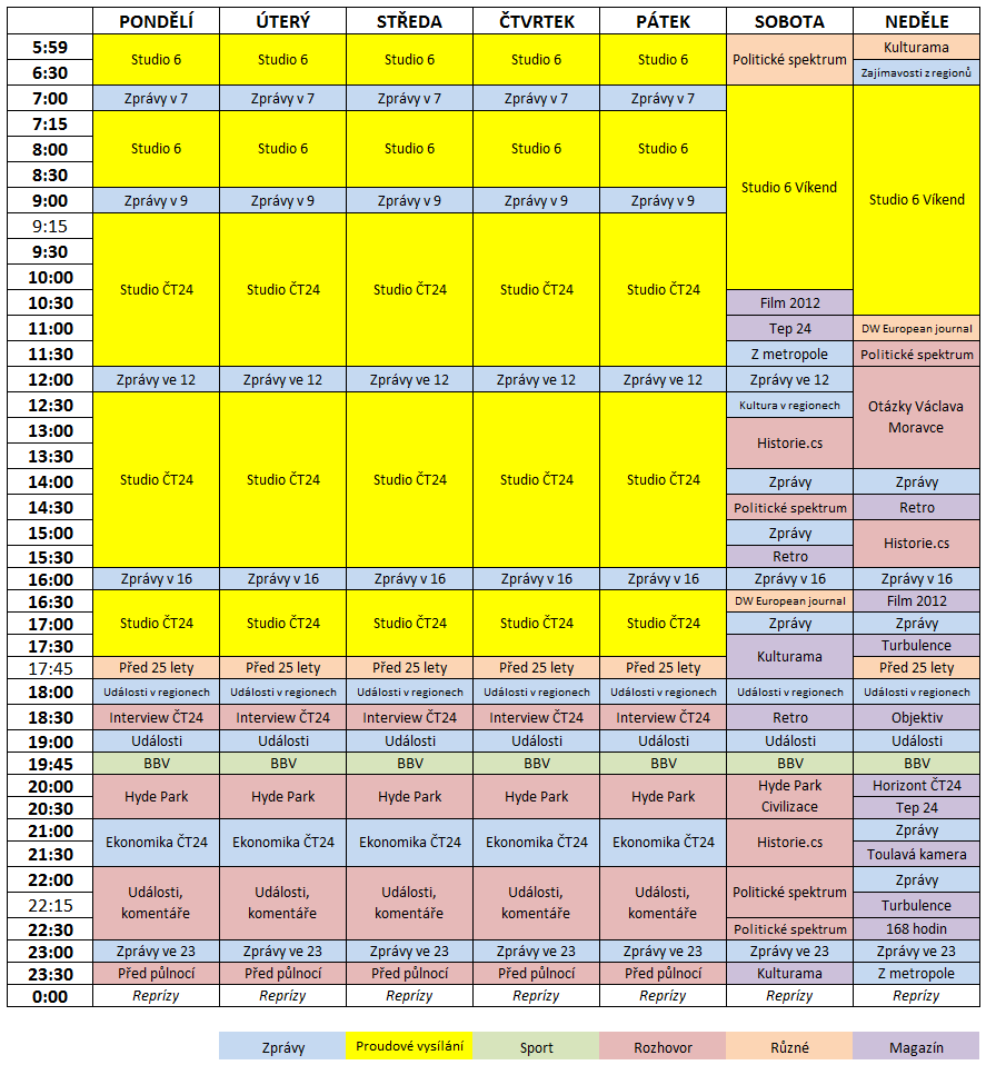 Nedělní dopoledne zahájí DW European Journal, v 11:05 bude nasazena repríza (premiéra v sobotu v 16:30), dosud byli diváci zvyklí na vysílací čas v 09:35. ČT24 zkracuje stopáž pořadu Turbulence, každou neděli sledujte pořad o počasí a jevů s ním souvisejících vždy v čase 17:30-17:45. Horizont ČT24 si sice zachová vysílací čas, ale místo konce ve 20:50 skončí o 20 minut dříve. Zbylou půlhodinu do 21:00 vyplní repríza magazínu Tep 24. V programovém schématu si najdou místo reprízy Toulavé kamery (21:30).
