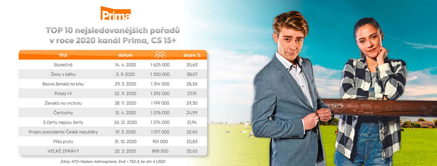 Uplynulý rok přinesl skupině Prima rekordní sledovanost. V celodni dosáhla průměrný share 25,11 % (meziroční nárůst o 0,79 p. b.) v CS 15–69 let a 24,78 % v CS 15+. Seriálovým fenoménem se stala Slunečná, jejíž premiérové večerní díly v úterý i čtvrtek sledovalo průměrně 1 320 000 diváků v CS 15+. Skokanem roku v online prostředí se stal zpravodajský portál CNNPrima.cz, který v prosinci navštívilo téměř 2,5 mil. reálných uživatelů, a zařadil se tak mezi TOP 6 zpravodajských webů. Pro rok 2021 plánuje i seriálové novinky.