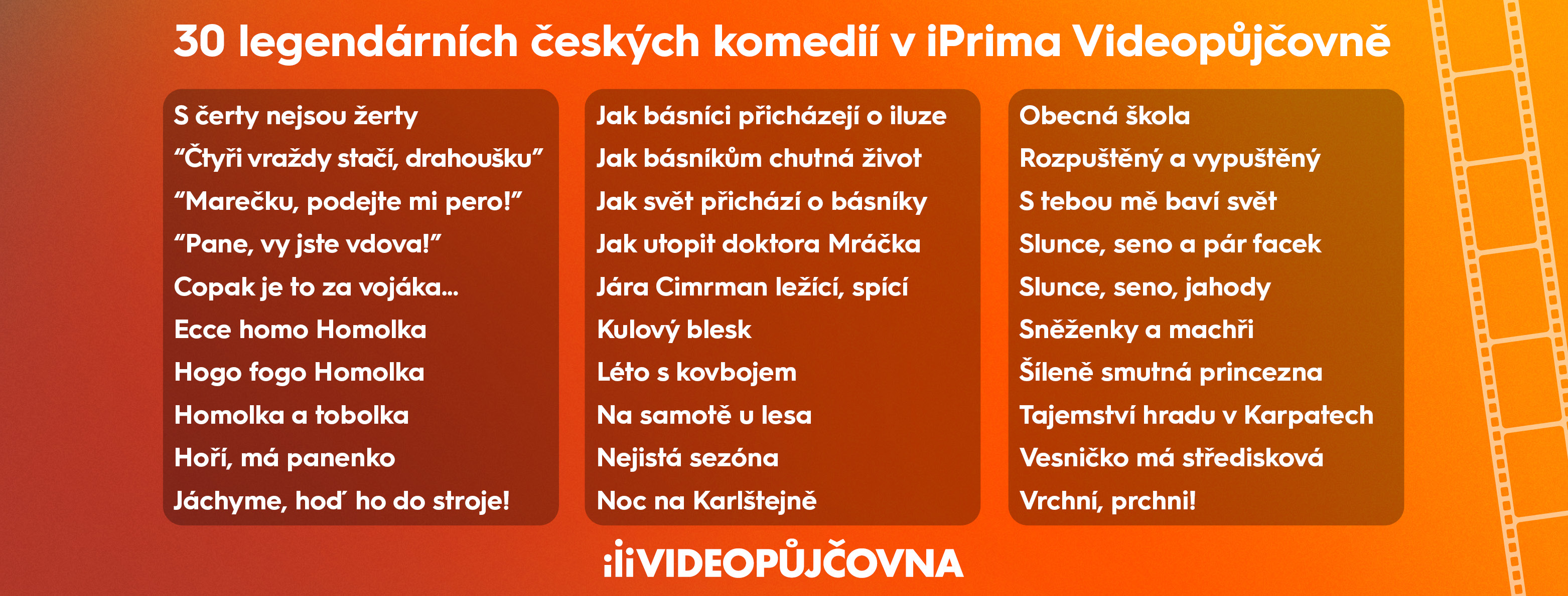 Vrchní, prchni!, S tebou mě baví svět, Rozpuštěný a vypuštěný, Na samotě u lesa, Léto s kovbojem, ale i série o Básnících, Obecná škola, „Marečku, podejte mi pero“, Jára Cimrman ležící, spící, Kulový blesk či klasické české pohádky jako Šíleně smutná princezna nebo S čerty nejsou žerty nově nabízí skupina Prima ke zhlédnutí online. České snímky napříč žánry, které se těší stálé divácké oblíbenosti již několik desetiletí, si nově mohou uživatelé půjčit v iPrima Videopůjčovně za 49 Kč na 48 hodin.