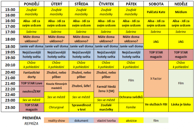 Příznivci vaření mohou ladit v 18:30 pořad Jamie vaří doma, britská kuchařská show pod vedením Jamieho Olivera půjde částečně v přímé konkurenci Prostřeno! na Primě family. Renovace v utajení končí a v 19:05 zhlédneme dokumentární cyklus „Nejúžasnější hotely světa„. Další programoé změny se na Primě LOVE nechystají. Zhubni, nebo přiber pokračují v novém čase ve 20:40, úterky po 21:40 patří reality-show Kouzla filmových maskérů, středy Zhubni, šéfe a konečně čtvrtky Farmář hledá ženu 3 – slovenská verze. Premiérová, poslední osmá řada Zoufalých manželek se bude nadále vysílat ve čtvrtek ve 23:50.