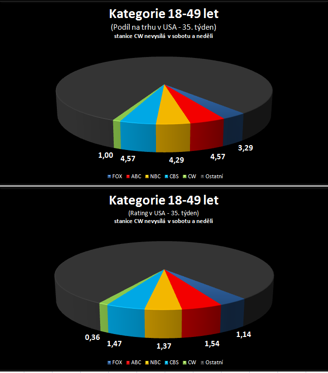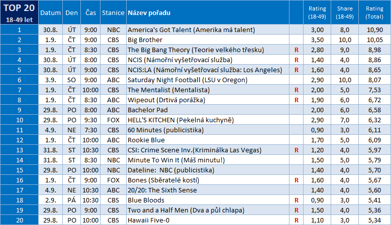 Stále se daří CBS i s reprízami The Big Bang Theory (Teorie velkého třesku), čtvrteční díly zaujaly 2,6% (share: 9%), resp. 2,8% (share: 9%), oba díly zajistily vysoce nadprůměrný výsledek. Dodejme, že na Primu Cool se chystá repríza třetí série a premiéra čtvrté série. Během týdne měla největší úspěch ABC se sportovním přenosem.