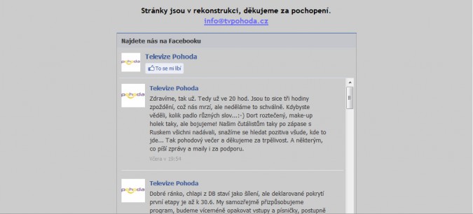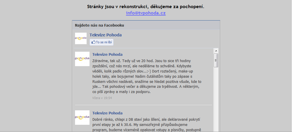 Vysílen zbytečným laděním televizoru, rozhodl jsem se zkusit internet. Na webu televize Pohoda nepochybně bude nějaká informace. Inu, informace tam opravdu byla. Na třetí stránce výpisu z google (prvním odkazem při zadání hesla TV Pohoda je odkaz na server Digizone – hoši blahopřejeme k dobrému SEO) jsem našel odkaz, vedoucí na neexistující stránku, kde mi bylo doporučeno kontaktovat administrátora. Teprve po zadání webové adresy ručně jsem se dozvěděl, že jsou stránky ve výstavbě.