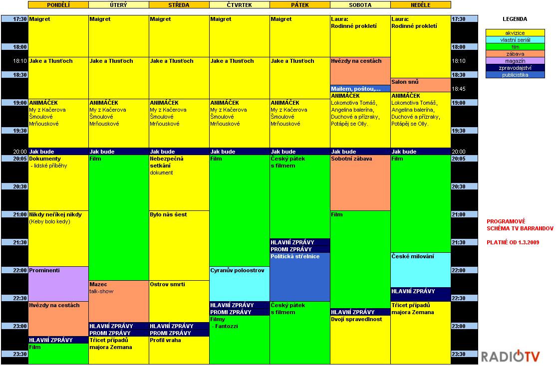 V dnešním článku se podíváme především na hlavní taháky komerčních televizních stanic a představíme vám všechny vysílací časy pořadů. Zaměříme se i na jejich šance v boji o diváky. Při kliknuti na logo každé stanice se vám zobrazí programové schéma včetně legendy.