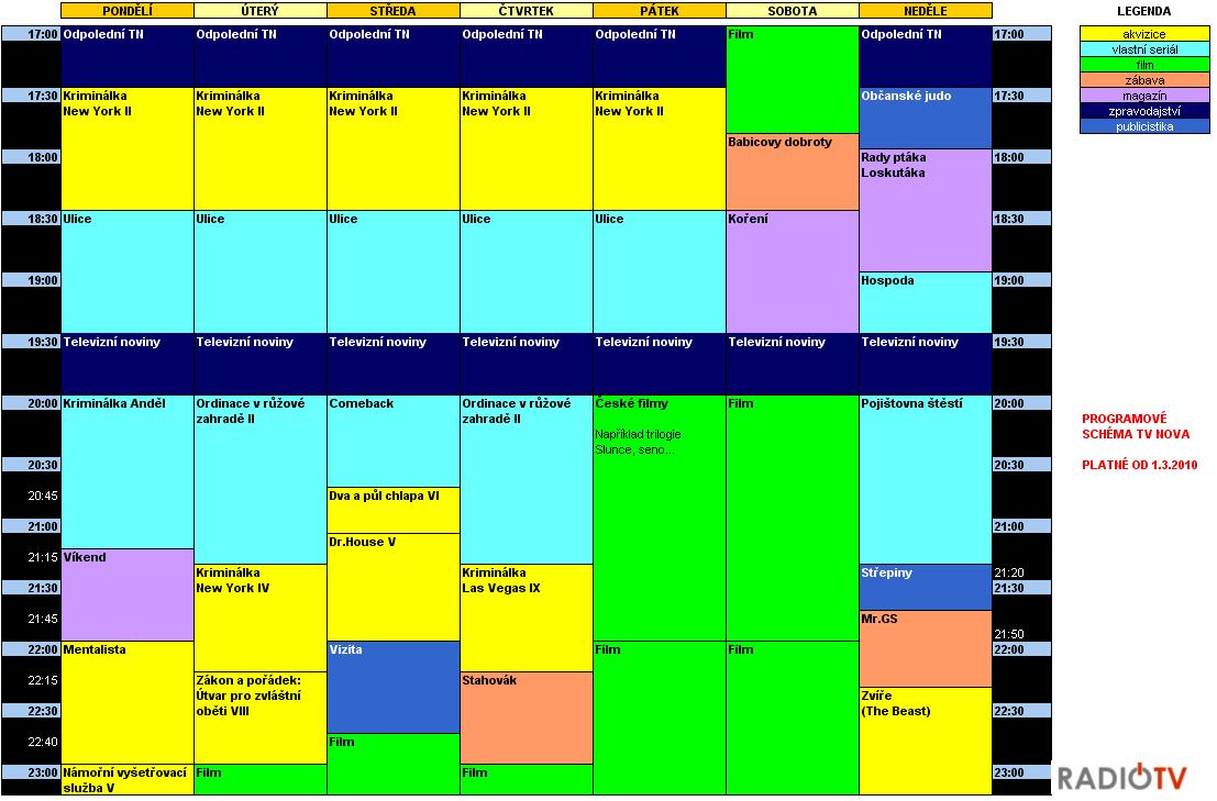Další dny v týdnu výraznější novinky nepřinesou, do programu se dostávají jen osvědčené seriály – Mentalita, Kriminálka Las Vegas, NY, Dr.House, Comeback a další. V neděli pak pokračuje už pátou (a s největší pravděpodobností i poslední řadou) Pojišťovna štěstí. První série se v tomto čase setkala s velkými ohlasy, dalším řadám Nova vyhradila vždy pondělí a středu.