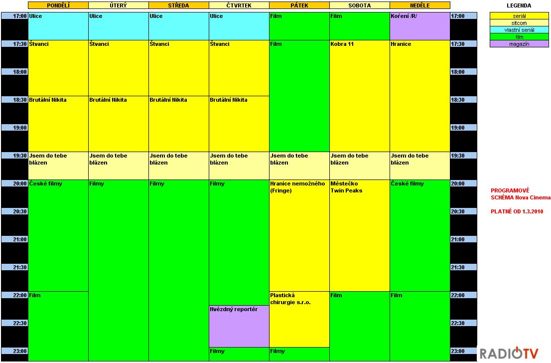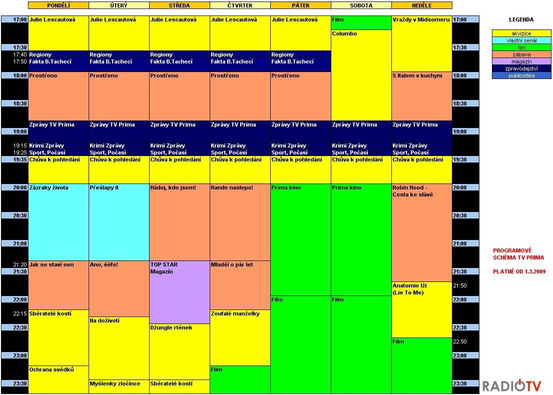 radiotv_jaro_2010ANALÝZA S KOMPLETNÍMI SCHÉMATY PROGRAMU – Všechny české komerční televize už své novinky na jarní část sezóny představily. Dnes se blíže podíváme na  největší trháky a především se můžete podívat na kompletní programová schémata všech tuzemských komerčních stanic. Prima jde do boje s mnoha novými formáty, Nova je s vlastní tvorbou opatrnější, přesto dvě novinky přinese. S prázdnou nejde na trh ani TV Barrandov.