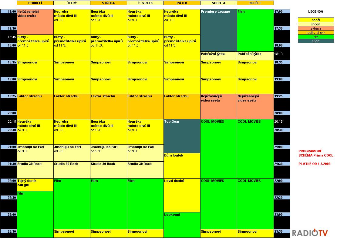 prima_cool_jaroPrima Cool se vydává od letošního roku jinou cestou, než tomu bylo doposud. Každý všední večer (pondělí – čtvrtek) bude vysílat ve stejných časech stejné seriály. Krok přispěje k přehlednějšímu a snadněji zapamatovatelnému schématu. V 20:15 nabídne divákům již třetí řadu seriálu Heuréka – město divů, nyní už ne jednou týdně, ale hned čtyřikrát. Reprízy jsou naplánovány na další den v 16:55. Od 9.března rovněž přijdou reprízy sitcomu Jmenuju se Earl, následovat je bude premiéra sitcomu Studio 30 Rock.