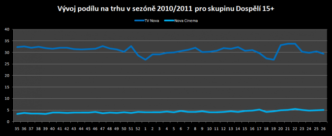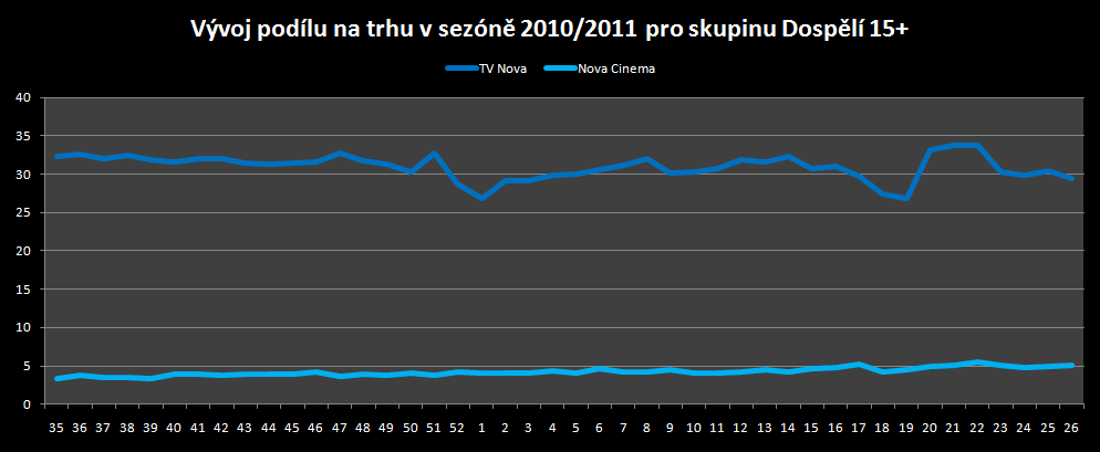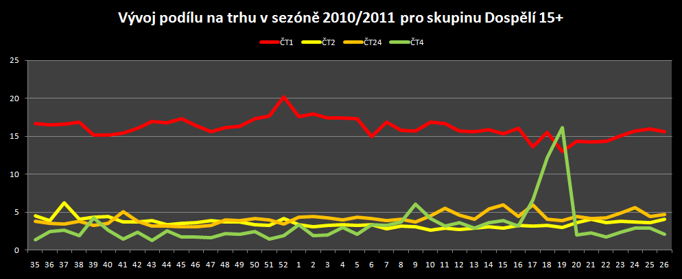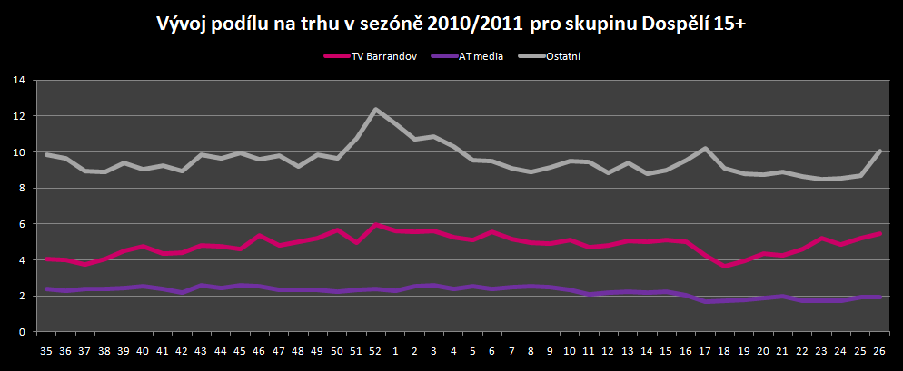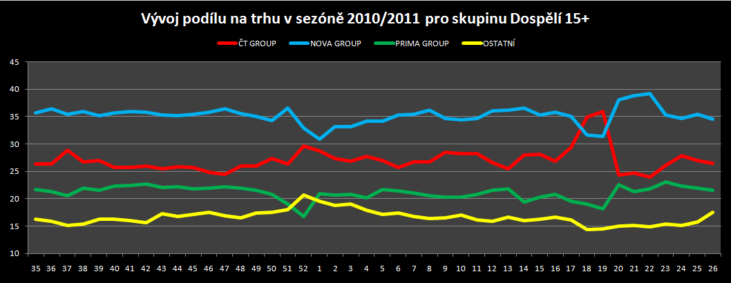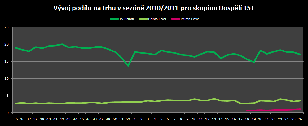 V článku se budeme zabývat obdobím od září 2010 do června 2011. Vynechány jsou měsíce července a srpen, jelikož v této době je sledovanost atypická. Číselné hodnoty najdete v přiloženém PDF dokumentu, uvnitř článku jsme pro vás přichystali grafy popisující vývoj sledovanosti ve sledovaném období v cílové skupině 15+. Jedná se o celodenní podíly na trhu.