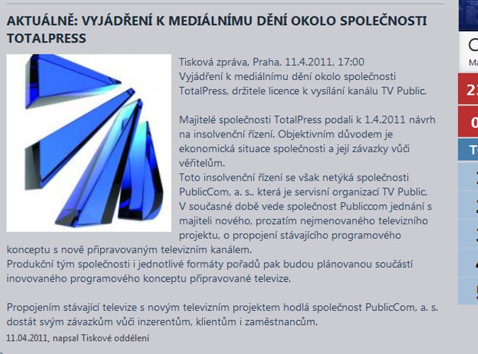 Existují různé způsoby, jak může společnost přiznat, že má nepřekonatelné finanční problémy, ale jen málokterá podobný fakt oznámí takovým způsobem, jakým to udělala firma TotalPress, provozovatel televizní stanice Public. Sdělit totiž věřitelům že sice mají smůlu ale, pokud by snad měli strach o stávající zaměstnance televize tak se nemusejí bát, protože krachuje pouze vysílatel, ale dodavatel programu je v pohodě, to si koleduje o komunikační anticenu roku. Konkrétně tisková zpráva uveřejněná na webových stránkách TV Public říká: