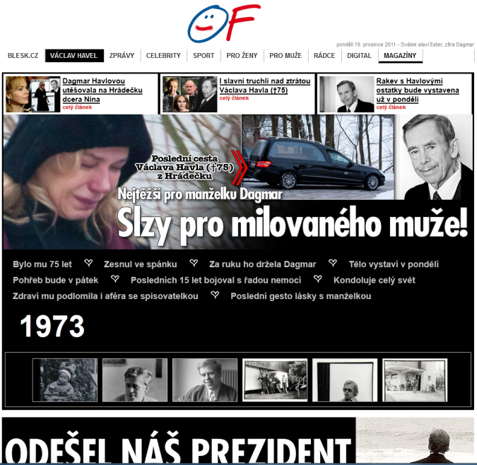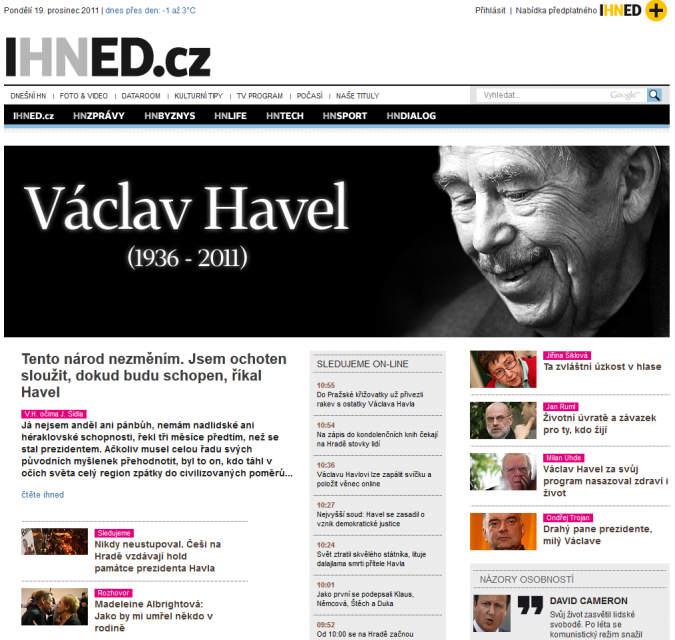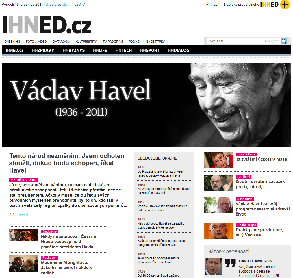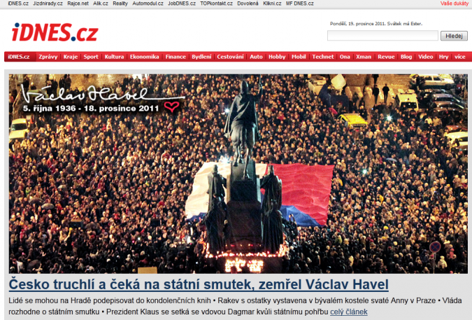 DOPLNĚNO – Nejen česká média včera reflektovala velmi smutnou zprávu o úmrtí Václava Havla, posledního československého a prvního českého prezidenta. Televizní obrazovky včera odvysílaly mnohé vzpomínkové dokumenty, snímky a mimořádné zpravodajské programy, nadprůměrné výsledky však přinesl včerejší den i TV Barrandov, která se osobě Václava Havla vůbec nevěnovala. A jak informovala tištěná a internetová média o smrti bývalého prezidenta?